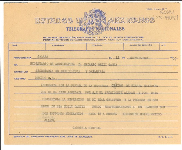 [Telegrama] 1949 sep. 12, Jalapa, México [a] Nazario Ortiz Garza, México D.F. [manuscrito] Gabriela Mistral.