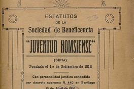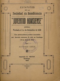 Estatutos de la Sociedad "Juventud Homsiense" : Fundada el 1o. de Setiembre de 1913 / Sociedad "Juventud Homsiense" Santiago : Impr. i Encuadernación "Almurched", [191.?] 15, [15] p. ; 19 cm. .