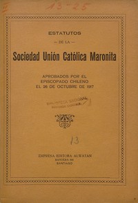 Estatutos de la Sociedad Unión Católica Maronita : aprobados por el episcopado chileno el 26 de octubre de 1917. Santiago de Chile : Imprenta Chile, 1918. 10 páginas ; 15 cm. .