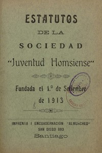 Estatutos / de la Sociedad de Beneficencia Juventud Homsiense Siria. Santiago : Impr. Al Watan, 1920. 21, [19] p. ; 19 cm. .