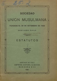Estatutos / Sociedad Unión Musulmana. Santiago de Chile : Sociedad Unión Musulmana, 1926. Santiago de Chile : Empresa Editora Alwatan, 1926. 11, [14] páginas ; 19 cm. .