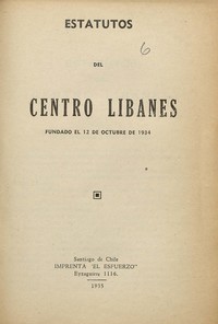 Estatutos del Centro Libanés. Santiago : Imprenta El Esfuerzo, 1935. 12 páginas 20 cm. .