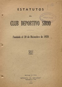 Estatutos / Club Deportivo Sirio. Santiago : Impr. El Esfuerzo, 1935. 15 páginas ; 18 cm. .