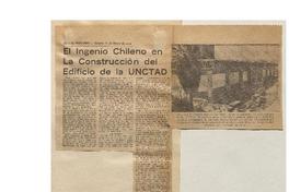 El ingenio chileno en la construcción del edificio de la UNCTAD [artículo]. [Santiago] : El Mercurio, 11 de marzo de 1972. El Mercurio. -- (11 marzo 1972), página 12. 1 página : fotografía en blanco y negro ; 29 x 28 cm. .