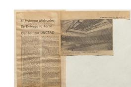 El próximo miércoles se entrega la torre del edificio UNCTAD [artículo]. [Santiago] : El Mercurio, 10 de marzo de 1972. El Mercurio. -- (10 marzo 1972), página 23. 1 página : fotografía en blanco y negro ; 28 x 33 cm. .