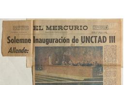 Solemne inauguración de UNCTAD III Allende [artículo] : [Santiago] : El Mercurio, 14 de abril de 1972. El Mercurio. -- (14 abril 1972), página 1. 1 página : fotografía en color ; 31 x 19 cm. .