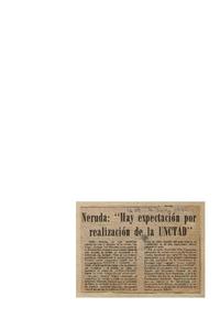 Neruda : "hay expectación por realización de la UNCTAD" [artículo]. [Santiago] : la Tercera, 24 de marzo de 1972. La Tercera. -- (23 marzo 1972), página 5. 1 página ; 9 x 13 cm. .