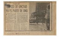Edificio de UNCTAD ya es parte de la ONU ceremonia oficial. [artículo] : [Santiago] : La Prensa de Santiago, 4 de abril 1972. La Prensa de Santiago. -- (04 abril 1972), página [1]. 1 página : fotografía en blanco y negro, 19 x 28 cm. .