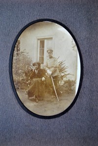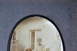 Retrato ovalado de dos jóvenes, uno de ellos de pie y vestido de uniforme militar con un sable en sus manos, acompañando a una mujer que se encuentra sentada.
