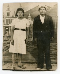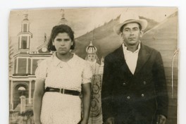 [Olga y Arcadio Gallardo delante de telón con virgen y santuario] [Fotografía]. Olga Gallardo. Chile : [Editor no identificado] , 1928. 1 Fotografía : Formato digital, monocromo. .