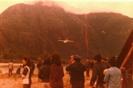 En la fotografía se ve a un grupo de personas observando a la avioneta al aeródromo de Caleta Tortel, esta avioneta arribava una vez al mes.