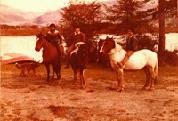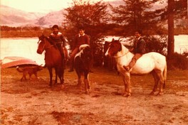 [Retrato grupal de tres hombres montando a caballo en el sector de río Pascua] [fotografía]. Chile : [Editor no identificado] , 1982. 1 Fotografía : Formato digital, Policromo. .