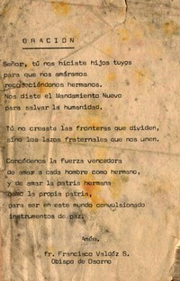 Fotografía de una oración cristiana escrita por Francisco Valdés S. Obispo de Osorno.