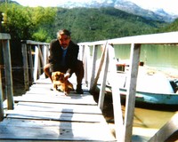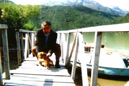En la fotografía aparece Onorindo Guelet sosteniendo un perro, cerca de la bahía de Caleta Tortel.