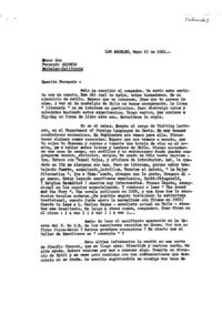 Le informa que aceptó el cargo de Visinting Lecturer, en el Department of Foreign Languages de Davis. Comenta que terminó el libro "La mujer cibernética", además le llamo la atención que Mariano Picón Salas no firmara el manifiesto de La Gaceta de F. de C.E., según lo que comentó Claudio Giaconi en una carta que le envío. También informa que Manuel Rojas llegará pronto a Los Angeles a una conferencia.