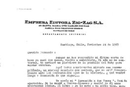 Santiago, Chile [a] Fernando Alegría Carta, 24 de noviembre 1963, [manuscrito] Enrique Lafourcade.