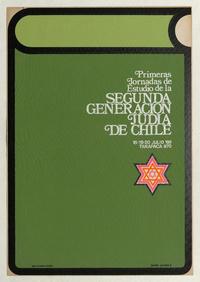 Primeras Jornadas de Estudio de la segunda generación judía de Chile [estampa] / Daniel Gleiser. [Santiago, Chile] : [Editor no identificado], 1969 (Santiago, Chile : Silk screen chilena). 1 cartel (afiche) : color ; 54 x 37,5 cm. .