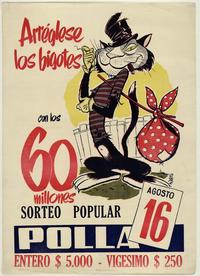 Arréglese los bigotes con los 60 millones sorteo popular Polla / [estampa] : René Ríos Boettiger ; seudónimo: Pepo. Chile : [Editor no identificado], [195-?]. 1 cartel (afiche) : color ; 77 x 55 cm. .