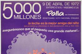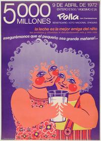 Polla, con 2 terminaciones 5.000 millones / [estampa] : Waldo González. Chile : Polla Chilena de Beneficencia, 1972. 1 cartel (afiche) : color ; 74,5 x 53 cm. .