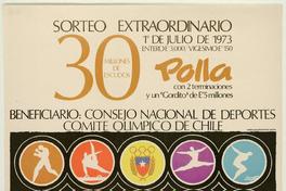 Polla, con 2 terminaciones 30 millones de escudos / [estampa] : Waldo González. Chile : Polla Chilena de Beneficencia, 1973. 1 cartel (afiche) : color ; 67 x 46,5 cm. .