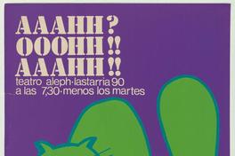 Aaahh? Ooohh!! Aaahh!! teatro Aleph / [estampa] : Jorge Soto Veragua ; seudónimo: Veragua. Chile : [Editor no identificado], [1973]. 1 cartel (afiche) : color ; 54 x 38 cm. .