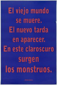 El viejo mundo se muere. El nuevo tarda en aparecer. En este claroscuro surgen los monstruos [estampa]. Santiago, Chile : [Editor no identificado], [2022]. 1 cartel (afiche) : color ; 75 x 50 cm. .
