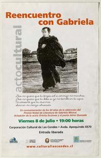 Reencuentro con Gabriela acto cultural. [estampa] / [Santiago, Chile] : [Editor no identificado], 2003. 1 cartel (afiche) : color ; 44 x 28 cm. .
