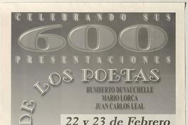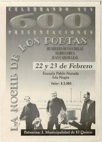 Celebrando sus 600 presentaciones la noche de los poetas. [estampa] / [El Quisco, Chile] : [Editor no identificado], [199-?]. 1 cartel (afiche) : blanco y negro ; 54 x 38,5 cm. .