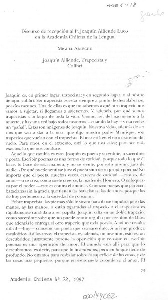 Discurso de recepción al P. Joaquín Alliende Luco en la Academia Chilena de la Lengua [artículo] Miguel Arteche.