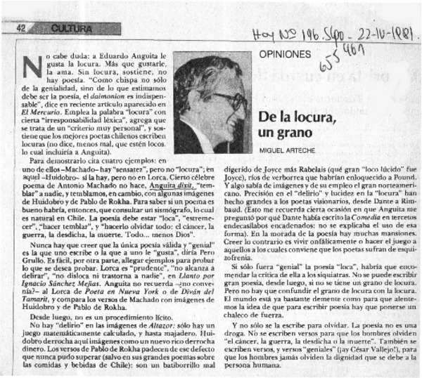 De la locura, un grano [artículo] Miguel Arteche.