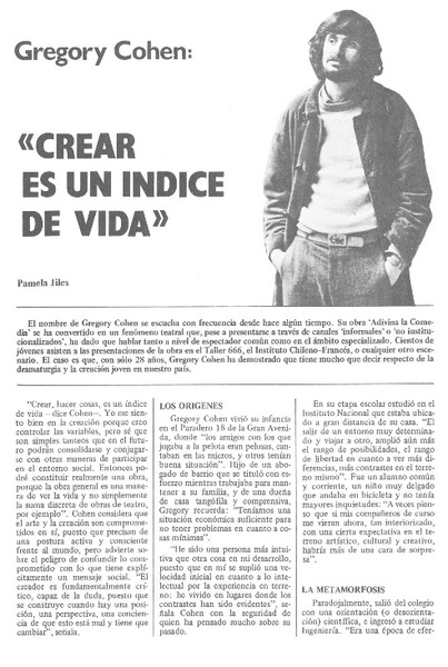 Crear es un indice de vida" [artículo] Pamela Jiles.