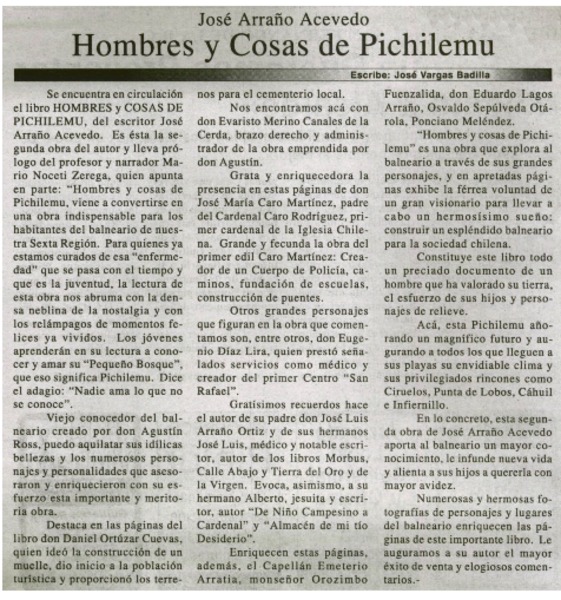 "Hombres y cosas de Pichilemu" un nuevo libro de José Arraño Acevedo [artículo] : por Emilio Ávila Aguilera.
