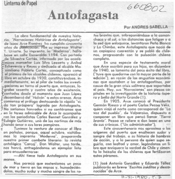 Fundación de Antofagasta [artículo] Andrés Sabella.