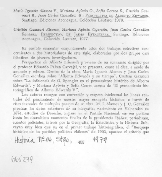 GAZMURI RIVEROS, CRISTIAN - Alamos V., María Ignacia - Eyzaguirre, Jaime - EDWARDS VIVES, ALBERTO - Autores chilenos - Perspectiva de Alberto Edwards - Perspectiva de Jaime Eyzaguirre