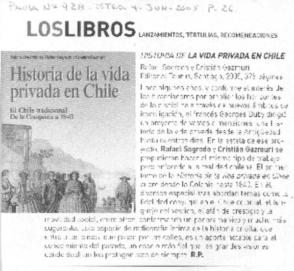 GAZMURI RIVEROS, CRISTIAN - Autores chilenos - SAGREDO B., RAFAEL. - Sagredo Baeza, Rafael - Entrevistas - Historia de la vida privada en Chile