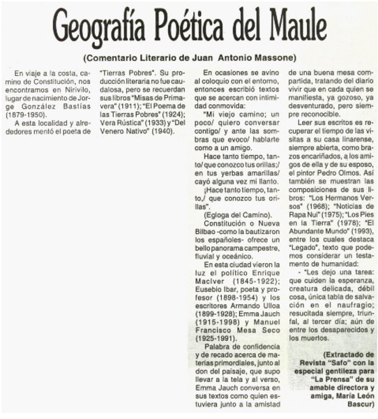 Emma Jauch, la voz poética del Maule [artículo] S. V. Y.