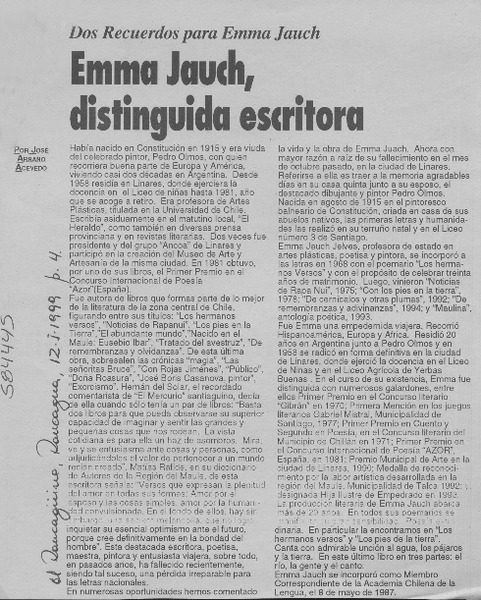 Emma Jauch, distinguida escritora, descansa en paz [artículo] José Arraño Acevedo