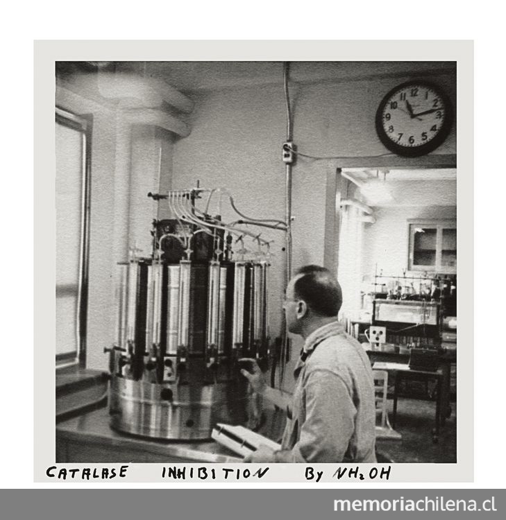 - Aída Traverso en el laboratorio de Bioquímica de la Facultad de Química y Farmacia de la Universidad de Chile, hacia 1955
