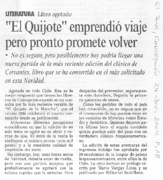 "El Quijote" emprendió viaje pero pronto promete volver [artículo]