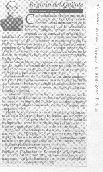 Regreso del Quijote. [artículo]Ulises Valderrama