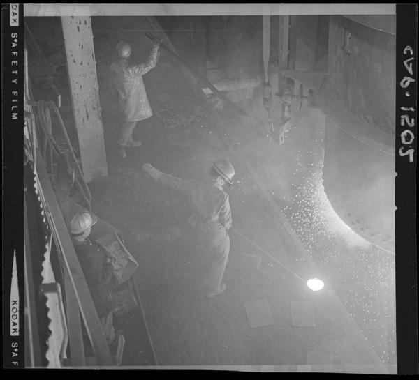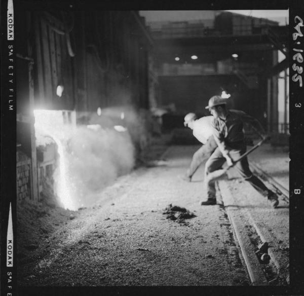 [Trabajadores en altos hornos de la fundición de acero] [fotografía] Luis Ladrón de Guevara.