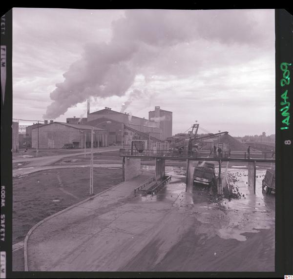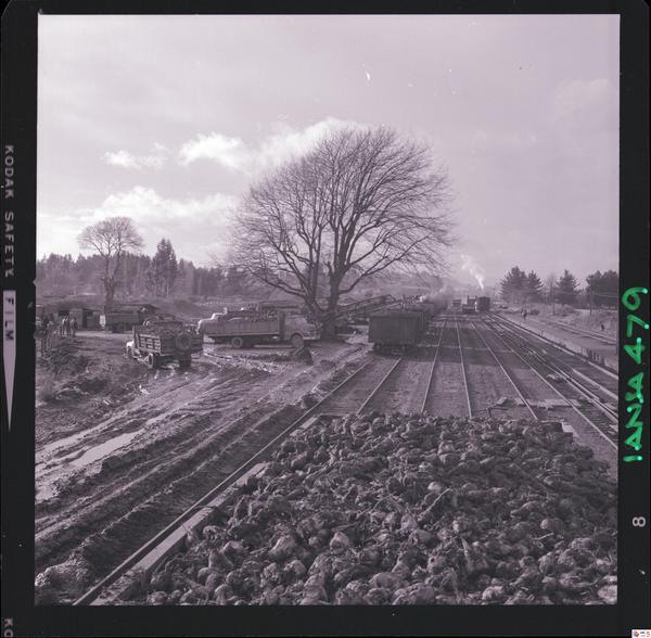 [Iansa (Chile) : Camiones cargando en vagones de acarreo para su transporte el producto de la cosecha de remolacha azucarera] [fotografía] Luis Ladrón de Guevara.