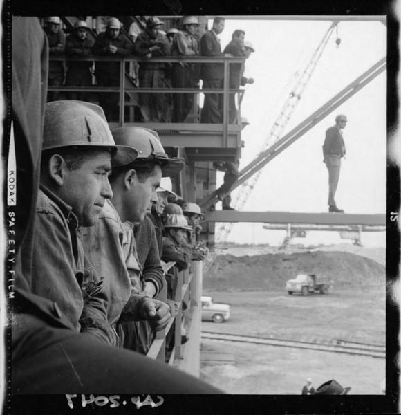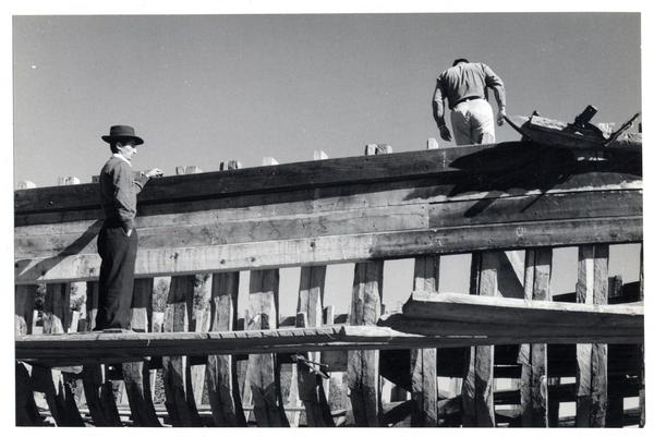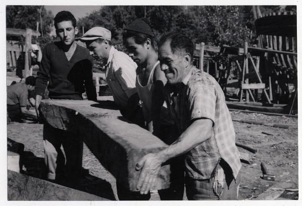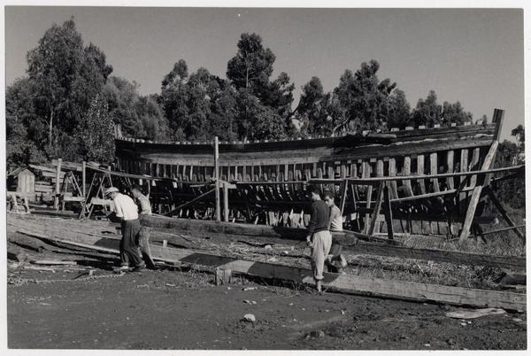 [Trabajadores en sus labores de construcción en los] Astilleros del Maule [fotografía] Domingo Ulloa.