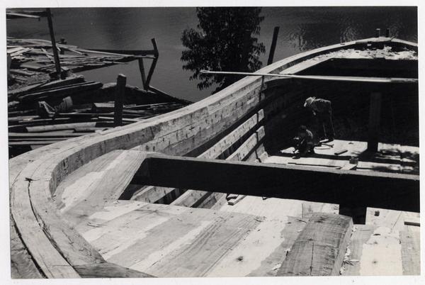 [Trabajador junto a una embarcación] [fotografía] Domingo Ulloa.