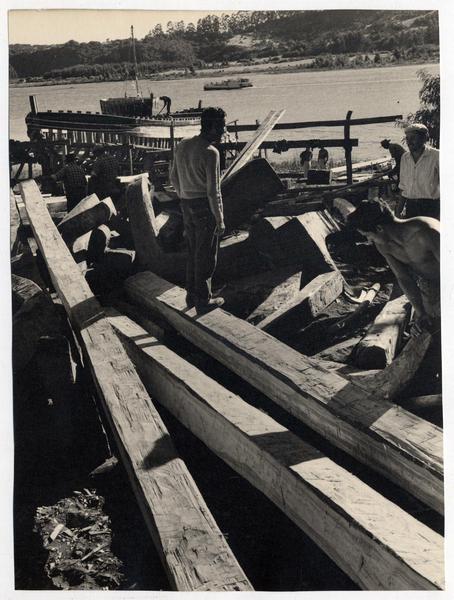 [Trabajadores del Astillero en la ribera del Río Maule] [fotografía] Domingo Ulloa.