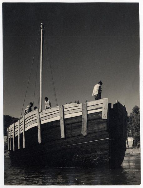 [Trabajadores del astillero a bordo de una embarcación en el río Maule] [fotografía] Domingo Ulloa.