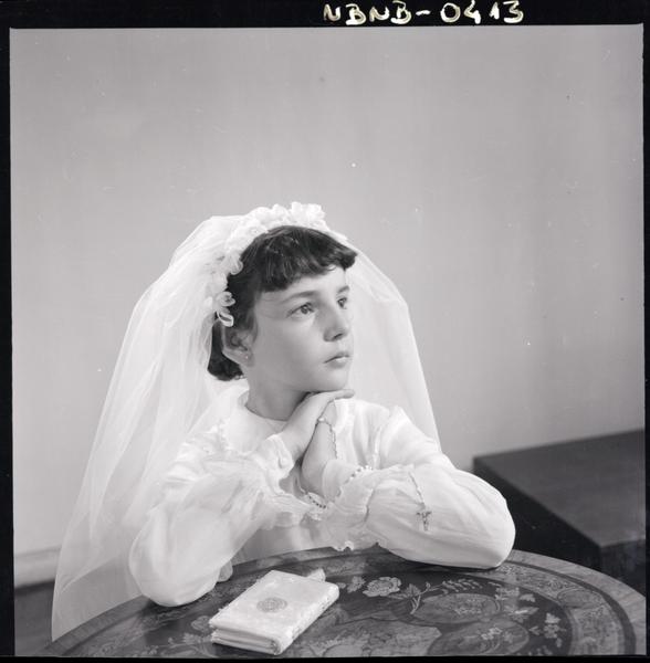 [Bebé [niña] con vestido recogido color blanco con mangas cortas englobadas, pelo ondulado y con un dedo en la boca] [fotografía] Kyutaro tunekawa.