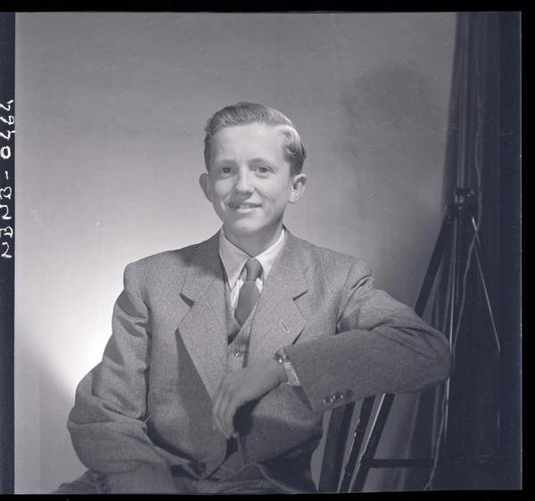 [Bebé con traje de lana con rayas en las mangas, sentado sobre un felpudo con un jueguete en sus manos] [fotografía] Kyutaro Tunekawa.