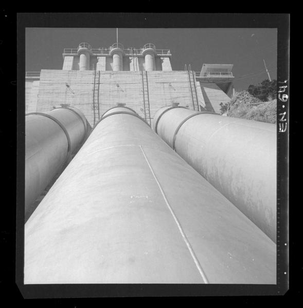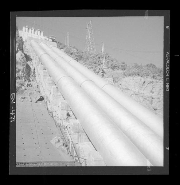 [Vista de las cañerías metálicas que conducen el agua de la cámara de carga a la casa de máquinas, en caida casi vertical de 120 m.] [fotografía] Luis Ladrón de Guevara.