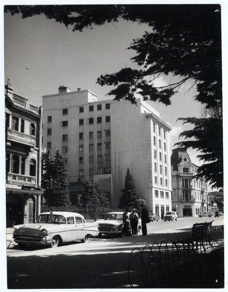 [Edificio de la antigua Clínica Santa María : Automóviles estacionados en el frontis; se divisa parte del Cerro San Cristóbal] [fotografía] Ignacio Hochhäusler.